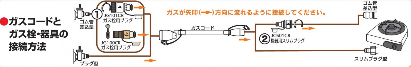 JIS規格品のガスコードは、どなたでも安全に使用できます。ただし、ヒューズガス栓やガス器具のガス接続口がφ9.5ガスホースエンドの場合には、「ガス栓用プラグ」や「器具用スリムプラグ」を利用する必要があります。