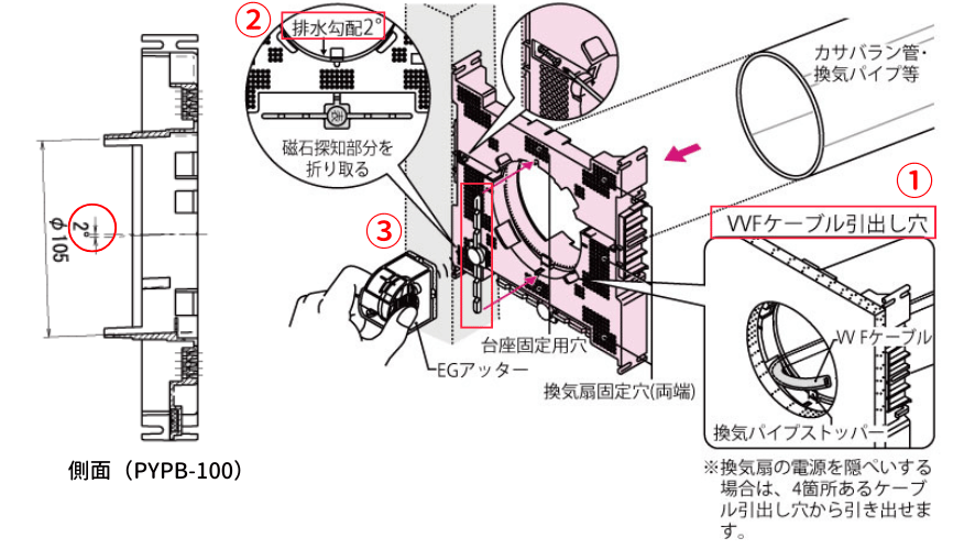 換気扇の電源を隠ぺいする場合は、本体にある4か所の電源ケーブル用引き出し穴を活用すると、見た目もきれいに仕上げることができます。(図1の①)