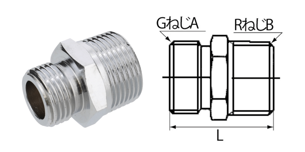 管用テーパめねじ(Rc)と管用平行めねじ(G)を接続|フレキ用ニップル
