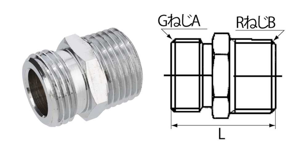 管用テーパめねじ(Rc)と異径の管用平行めねじ(G)を接続する「異径フレキ用ニップル」