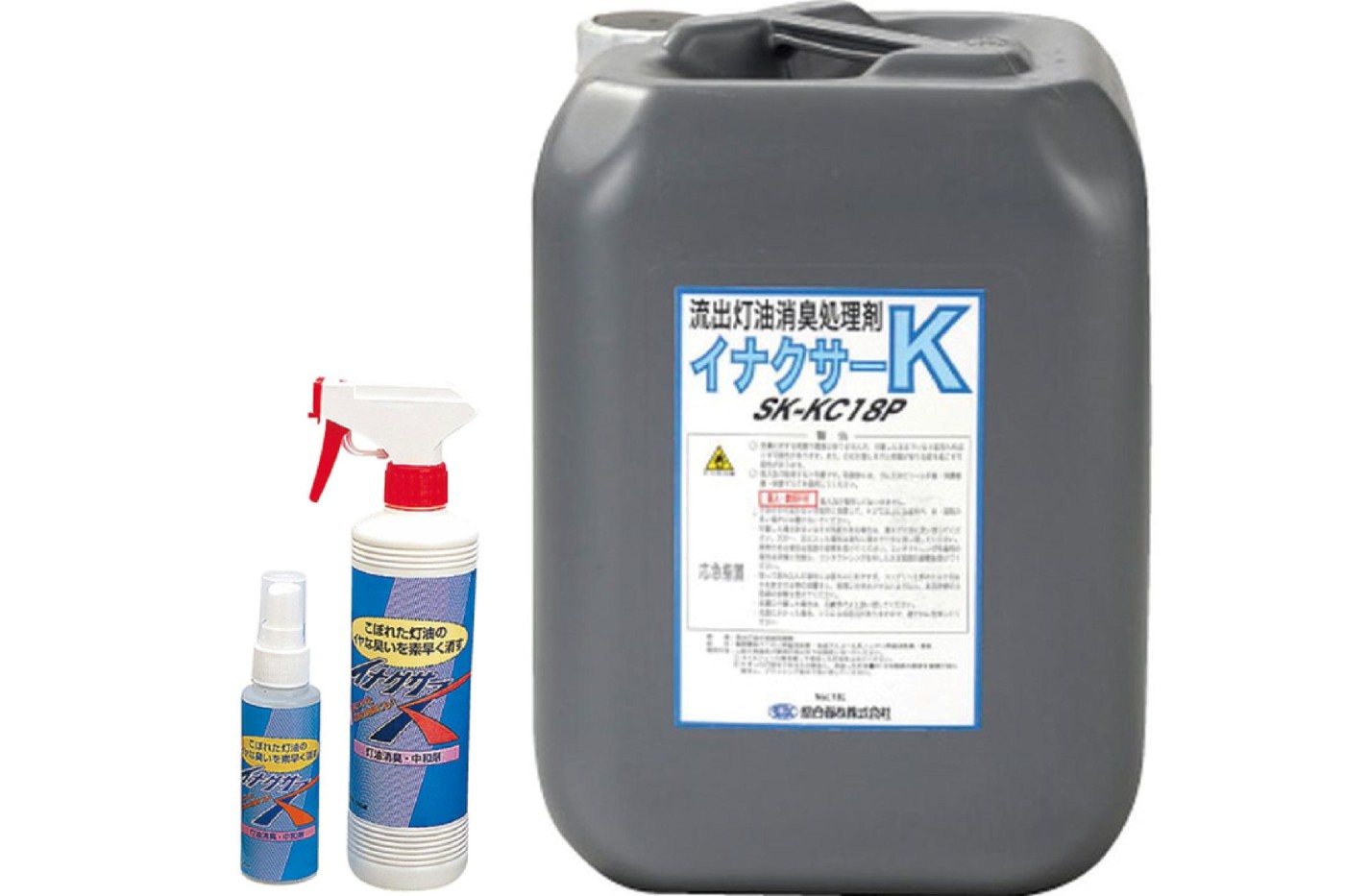 灯油の臭いと油染みを軽減させ引火性を有しない状態にする「灯油消臭処理剤イナクサーK(SK-KCシリーズ)」1本(缶)から受注当日出荷しております
